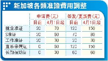 4月1日起,就業准證的簽發和更新費為150新元,S准證和工作準證分別調高到80新元和30新元。人力部1月10日發文告說,人力部從2005年開始,向僱主徵收辦理相關准證的行政費,不過這筆費用卻明顯低於所需的成本費。
