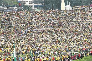 場內集會者在主辦方的帶領下,高呼“默迪卡”。場內爆滿,幾乎插針都不入。那些沒有坐位的集會者,不畏炎陽就地坐在默場內的草地上,耐心等候聆聽領袖的演講。在等待的當兒,場內集會者也玩起“人海波浪”,連貴賓席的領袖們也參與一份,場面熱鬧開心。