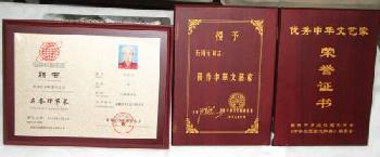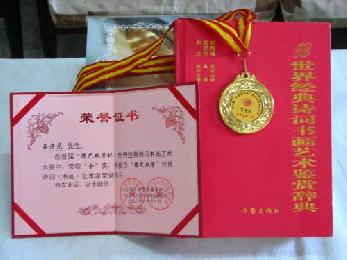 2008首屆“德藝雙馨杯”世界經典詩詞書畫藝術大賽金獎,獲授予經典詩詞(書畫)藝術家榮銜。