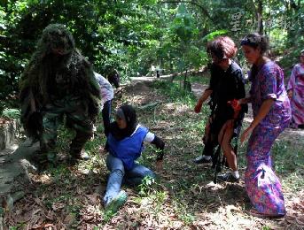 一名參賽者因沒留神有“殭屍"埋伏於樹旁,而不禁嚇得失足跌坐在地,而引來了附近的殭屍圍攻。(圖:星洲日報)