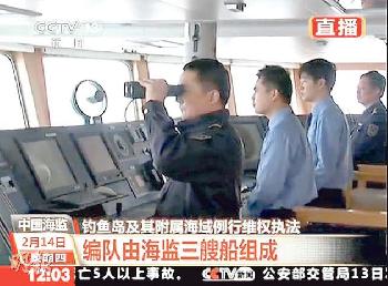 (中國)跟中國海監船隊隨船採訪的中央電視台記者,2月14日在距釣魚島13海里的海域與北京連線作實況報導,向觀眾展示遙遙在望的釣魚島主島及其附屬島嶼南小島。央視記者並預告,過幾天不排除在更近的距離拍攝。