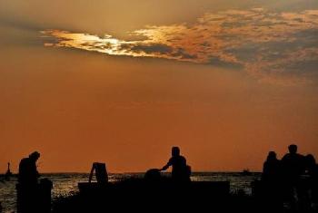 人潮雖多,卻聽不見喧鬧聲,只見悠閒的人們都輕聲細語在聊天,怕驚動了欣賞日落美好的氣氛,而談情的男女都在耳鬢竊竊私語和互道情話綿綿,愛的氛圍瀰漫了整個天空,為這夜幕低垂增添了浪漫情懷,而我猶如黃雀在後,拿著相機在他們身後按下一張又一張的快門,把他們的背影都一一裝滿在我的鏡頭下。