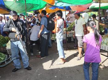 沒有跡象顯示“蘇祿軍"有投降的意願,雙方在7日早仍然發生了2次鎗戰;因此,地毯式搜查“蘇祿軍"殘余份子的行動會持續進行。圖為荷鎗實彈的警員駐守在仙本那菜市場,緊盯著所有進出當地的市民,嚴防“蘇祿軍"殘余份子化身為平民,潛入市集里採購食品。(圖:馬來西亞星洲日報)