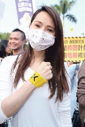 伊能靜在口罩寫上反核及在手上貼上「X」參與遊行。