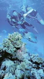 從開恩茲(Cairns)乘雙體船往外堡礁Norman Reef,船程約2個小時,目的地是一個可進行多種水上活動的海上平台。然而我們輕視了風浪的威力,沒有吃船上備有的暈浪丸,愈往外駛船隻搖晃得愈厲害,結果一行四人下船時呆呆滯滯,胸口發悶,但活動時間表安排緊湊,甫下船就要乘半潛艇欣賞珊瑚礁,從半潛艇的玻璃窗看覑忽遠忽近的珊瑚和魚兒,更暈!忍不住要拿個嘔吐袋。返回海上平台,即問船員拿俗稱“薑片”的暈浪丸服用,幸好為時未晚,十多分鐘後不適感消失。