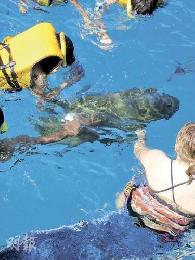 最好玩的,要算是教練拿出裝有麵包的瓶子時,魚群即將我們包圍。水底下雖有攝影師為我們拍照,可惜魚兒實在太多,無法拍到我們的樣子,要邊拍邊撥開面前的魚兒。