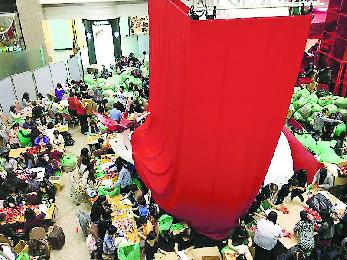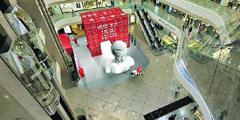 高逾5米的張國榮頭像已豎立時代廣場等待揭幕,電腦模擬圖顯示頭像造型(下圖),現場數十歌迷努力摺紙鶴,準備創世界紀錄。(圖:香港明報)