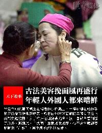 以往只現汕頭街頭的古老美容法——“挽面”,隨著復古時尚的興起,如今進入到現代的美容院,汕頭一美容院的老闆愛娟小姐告訴記者,由於“挽面”能使皮膚愈挽愈細緻,又起到臉部按摩作用,還可延緩汗毛再生,現在很多顧客都喜歡。