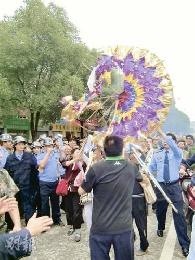 直到大約3時30分左右,兩架載著5、6個花圈的電單車抵達法院附近,兩名男女將寫有“朱軍一路好走”條幅的花圈向群眾展示及放鞭炮,說是要向鎗殺3名法官、為民吐怨氣的朱軍致敬;此舉引發民眾起哄,十數名上訪者更拿著花牌向法院衝去,現場戒備的警察見狀即上前撕搶花圈,並意圖拉走上訪者,周圍民眾見狀同時叫嚷,場面一度失控。