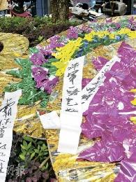 訪民向鎗擊案施襲者朱軍獻花圈,上書“朱軍一路走好”。(圖:香港明報)