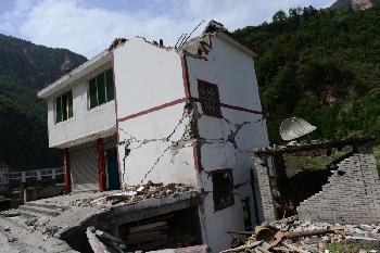 寶盛鄉居民房屋在地震中損毀嚴重,屋身傾斜,隨時倒塌。(圖:新華社)