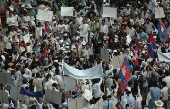(柬埔寨)在救國黨副主席庚速卡的領導下,近千人反對黨成員4月24日早在自由廣場舉行抗議集會,要求對柬國的選舉制度進行改革。