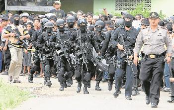 88反恐特遣隊隊員全副武裝抵達萬隆一個村莊,並在當地與恐嫌犯駁火近7小時,擊斃3人,逮捕1名嫌犯。(圖:印尼星洲日報)