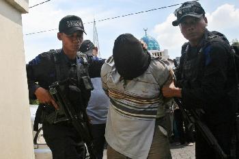 在中爪哇根達爾落網的恐嫌被押到雅加達。(圖:印尼星洲日報)