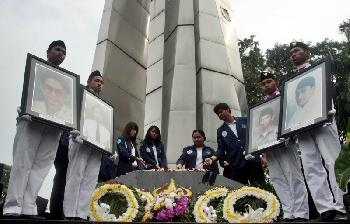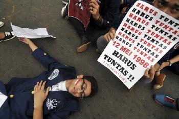 在場的大學生也為1998年5月12日事件中,在特利沙克蒂大學(Trisakti)校園遭治安人員擊斃的4名大學生獻花。