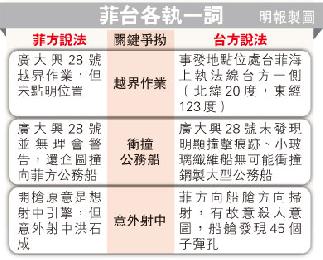 《馬尼拉公報》17日引述菲律賓海岸防衛隊呈交國家調查局的3頁報告,指菲公務船9日發現兩艘台灣漁船在巴林塘群島東部非法捕漁,公務船向天鳴鎗警告,要求對方停止。其中一艘漁船“廣大興28號”停下,一名船員更走出甲板。但當公務船準備登船檢查時,“廣大興28”號突然啟動引擎,先退後再加速向前,險些撞到公務船右舷。雙方之後展開追逐,公務船再次對空鳴鎗及鳴笛警告,但“廣大興28號”並無理會,公務船指揮官遂下令開鎗。