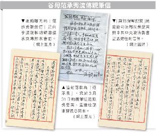 網上流傳的另一封范承秀信親筆信是2013年3月底所寫,致吳愛英、孟建柱請求探監。若最新信件為真,或是谷開來首次獲准見家人。左派分析指,檢方控制范的探監過程,是怕有關薄案證據流出,而范對女兒的勸告語帶雙關,指出薄家被打壓後妻離子散,要求谷保護好身體東山再起。