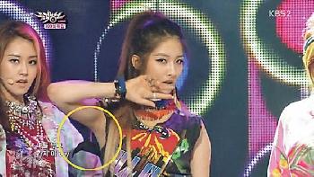 (韓國)韓國女子組合4Minute 5月17日擔任KBS電視台直播節目Music Bank表演嘉賓,隊長南智賢演唱時胸圍扣卻不慎彈開,吊帶下滑,幸好她穿的無袖背心夠密實沒有泄春光,她亦若無其事繼續表演,反而電視旁的粉絲替她緊張。