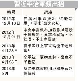 習近平自接掌軍權以來,先後推出“打勝仗”、禁酒令、“下連當兵”、禁用豪車等連串措施(見表)以從嚴治軍。有消息稱,中央軍委下文要求糾治軍隊在住房方面的不正之風。一是糾正錯誤的做法和規定,二是清理被認為違規的住房情,今後對各級軍官的住房標準要嚴格按規定治理。糾治行動從5月份開始,“10‧1”國慶節前結束,總政治部紀檢部還公開接受舉報。