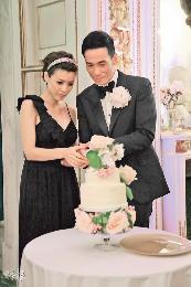 腹部微隆的陳茵媺與陳豪一起切結婚蛋糕,展開人生新一頁。(圖:香港明報)