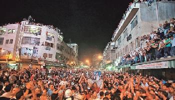 在約旦河西岸城市拉姆安拉,萬計巴勒斯坦民眾上街,慶祝阿薩夫成為首名勝出《阿拉伯偶像》的巴勒斯坦人。(圖:法新社)