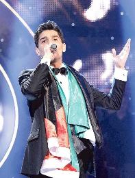 巴勒斯坦歌手阿薩夫(圖)成為《阿拉伯偶像》冠軍後,披上巴勒斯坦旗幟再次在台上獻唱。(圖:法新社)