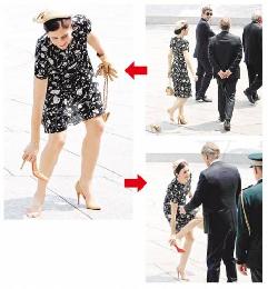 丹麥王妃瑪麗不小心甩掉高跟鞋,慌忙拾起鞋子穿上,一臉尷尬。(圖:香港明報)