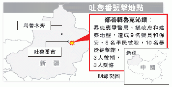 此次襲擊發生在新疆首府烏魯木齊以東220多公里的吐魯番地區鄯善縣魯克沁鎮,是東疆地區罕見的襲擊事件,以往的襲擊多數發生在南疆或靠近邊境的地區。新華社昨日下午發出英文稿,稱事件發生在昨日清晨6時,報導引述匿名官員稱,襲擊者持刀攻擊了當地派出所、政府辦公樓以及一個建築地盤,砍死17人,其中包括9名警察和保安以及8名市民,另外還有3人受傷。