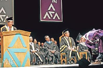 吳家進(右)在畢業典禮上向校監兼特首梁振英(左)三鞠躬,以示港府由中央控制,政權已死。(資料圖片)