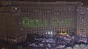 圖為周二在開羅解放廣場聚集的反對派示威者用激光在政府建築物投射「Game Over」的英文字,稱穆爾西已經“game over”。(圖:法新社)