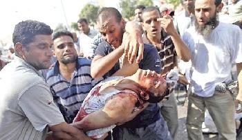 穆兄會斥軍方“政變”令埃及“重返專制制度”,拒與軍方扶植新政權合作,吁群眾上街。千計民眾昨往開羅共和國衛隊(Republican Guard)總部外集會,高呼“穆爾西是我們的總統”等口號,聲援懷疑被軟禁在內的穆爾西。法新社記者表示,當有一名示威者試圖將一幅穆爾西的肖像掛在總部外鐵絲網時,突然傳出多下鎗聲。記者稱,共和國衛隊成員曾先後兩次警告此人不要靠近,然後就開始開鎗。事發後,兩名死者伏屍現場,由布遮蓋,另一示威者頭部中鎗身亡,腦漿溢出。保安部隊還施放催淚彈,試圖驅趕示威者。