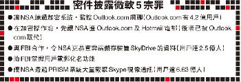 (英國)英國《衛報》引述斯諾登提供的新密件,揭發微軟(Microsoft)與美國國安局(NSA)“長期深入”合作,讓NSA繞過微軟的加密系統,截取Outlook.com的加密即時通訊。微軟還配合NSA監控旗下全球用戶高達6.63億人的Skype視像通話、擁有2.5億用戶的SkyDrive雲端數據庫及Hotmail電郵系統。微軟回應時重申,只會按法庭要求,向政府提供指定帳戶的數據。