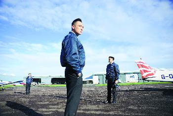 吳鎮宇飾演的Sam哥在《衝上雲霄II》與Holiday(陳法拉飾)、Captain Cool(張智霖飾)在緣份的天空下展開一段三角情緣。(圖:香港明報)