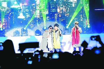 Gary(左起)、HaHa、金鐘國在見面會中穿上風衣及戴墨鏡、圍巾扮大哥獻唱《當年情》。(圖:香港明報)