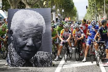 南非政府要求學童在上午8時停止上課,為曼德拉齊唱“生日快樂”歌,政府昨也象徵式把曼德拉的新式智能身份證交給其女兒辛琪(Zindzi),孫女恩迪萊卡則和其他南非民眾則在當地一間兒童宿舍做義工67分鐘,紀念曼德拉為打破種族隔離而付出的67年努力。環法單車賽第18站的賽會亦在起步前展示曼德拉的畫像(圖),向其致意。(香港明報)