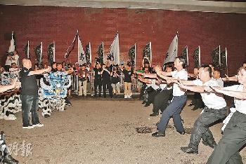香港大弟子鄭少秋率眾師弟在殯儀館門外迎九素獅齊耍拳。(圖:香港明報)