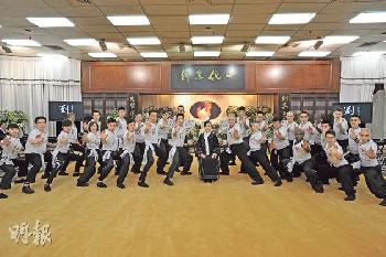 洪拳一代宗師劉家良舉殯,遺孀翁靜晶將靈堂佈置成武館,以師母身分率眾徒弟、徒孫在靈前拜別劉家良,並擺出功架,盡顯宗師氣派。(圖:香港明報)