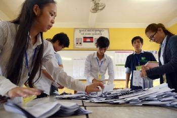 柬埔寨投票站的選舉管在投票結束后隨即進行計票。(圖:法新社)