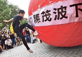 市民以不同方式表達“倒波”訴求,其中社民連準備了直徑9呎、貼上發展局長陳茂波肖像、要求他下台的“超級大話波”,讓市民拍打或腳踢。(圖:香港明報)