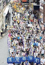 民陣發動要求發展局長陳茂波下台的遊行,大會昨稱有3000人參與,警方表示高峰時有2100人。參加者出動各式道具,例如有人撐起寫有陳茂波下台的雨傘等。(圖:香港明報)