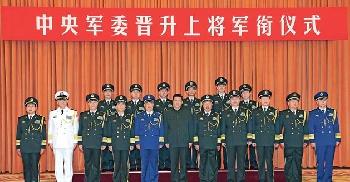 新華社報導,本次升上將的6名軍官是總政治部副主任吳昌德、總裝備部政治委員王洪堯、軍事科學院政治委員孫思敬、北京軍區政治委員劉福連、南京軍區司令員蔡英挺、廣州軍區司令員徐粉林。與習近平一樣,6名新上將均是“50後”,其中吳昌德、王洪堯和蔡英挺今年才剛滿足升條件,即“中將資歷4年,正大軍區職務2年”(詳見另稿)。其中1954年生的蔡英挺,以59歲成為最年輕上將。