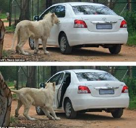 動物園內1頭重達130多公斤、半個人高的獅子與他們不期而遇,獅子趨前拍打他們前面1輛白色豐田轎車的車門,後來,竟然還用牙齒咬住汽車後門把手,拉開車門。