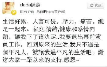 (香港)今年4月憑電影《低俗喜劇》奪得香港電影金像獎最佳女配角的陳靜(DaDa),昨晚10時在微博突然宣佈因家庭、情緒與健康等問題,退出娛樂圈。DaDa寫道:“生活好累,人言可畏。壓力,痛苦,總是一起來。家庭、情緒、健康和感情問題,讓我下了這決定……我要退出幕前演員工作,回到原來的生活,我只不過是個平凡人,就讓我過平凡的生活吧。謝謝大家一路以來的支持,感恩。”DaDa早於昨日中午已在微博透露口風,她慨嘆心灰意冷,不少粉絲叫她振作。似乎DaDa考慮了一日,下定決心離開幕前工作,故作出這公佈。
