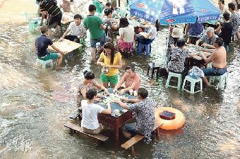 有餐廳將飯桌搬入水深30多厘米的河中,將吃飯、玩水集於一身,讓顧客品嚐美食的同時,又可以享受水中的清涼。而除了水中吃飯,重慶人還在水中打麻將。