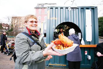 給海豹餵完小魚,是否自己也想吃一份?午餐就吃魚吧!從Oak Bay走回市中心,有一個大貨柜箱叫Red Fish Blue Fish,那是售賣英式炸魚薯條(Fish and chips)的大牌檔。這個檔攤以環保和保育為概念,所採用的食具全部都是循環再造,材料也要符合海洋生物保育的原則。此外,食客還可以點選自己喜歡的魚類,比目魚(Halibut)、三文魚(Salmon)和鱈魚(Cod),聽見已流口水了!
