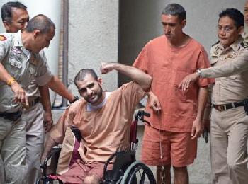 泰國曼谷南區刑事法院週四就去年的曼谷爆炸案判處兩名伊朗籍嫌犯;其中29歲的莫拉迪(坐輪椅者)當時向警察投擲手榴彈,不料手榴彈反彈,炸斷他雙腿。法院以企圖謀殺等罪名將他入罪,判他終身監禁。第二被告43歲哈扎伊(右二)則因私藏爆炸物,被判處15年監禁。(圖:法新社)