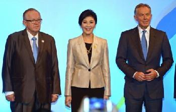 泰國政府主辦和解論壇週一在曼谷揭幕,由首相英叻(中)主持,英國前首相布萊爾(右)、曾獲諾貝爾和平獎的芬蘭前總統阿赫蒂薩(左)受邀出席,但在野民主黨和反塔辛人民民主聯盟(PAD)拒絕與會。(圖:法新社)