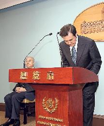 馬英九(右)在總統府內"發表沉痛聲明",之後鞠躬致意。