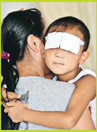 失去雙眼的山西男童小斌斌前日入住深圳希瑪林順潮眼科醫院,等待接受義眼移植手術,據悉他入院後常要抱緊媽媽,其父郭志平表示理解有關治療未算成熟,但仍對院方有信心。圖為斌斌與母親。(資料圖片)(圖:香港明報)