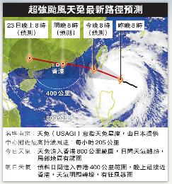 (香港)被喻為今2013年全球威力最強的超強颱風“天兔”正於台灣以南海域直逼香港,天文台預料天兔今日(9月21日)將進入香港800公里範圍,很大可能開始掛風球,22日正面襲港。天文台警告,由於時值中秋月滿天文大潮,水漲加上強風吹襲令水位上升,有可能產生風暴潮,呼吁市民警惕水浸。香港各行業嚴陣以待,旅遊界呼吁短途旅行團提早今日返港,惟港府至20日仍未有跨部門應變措施。